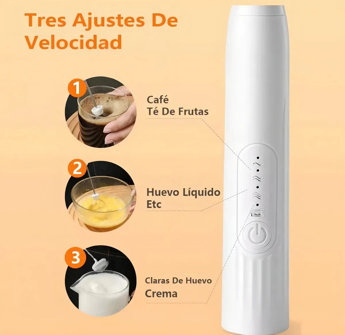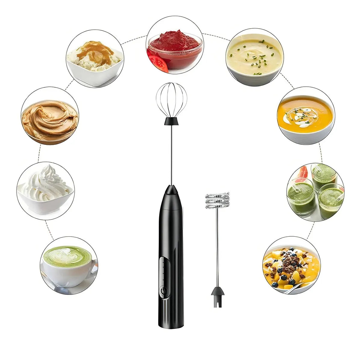 Funciones: espumar leche, batir líquidos (leche, café, chocolates, batidos), mezclar huevos o cremas en poca cantidad.